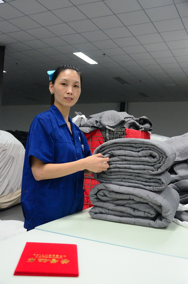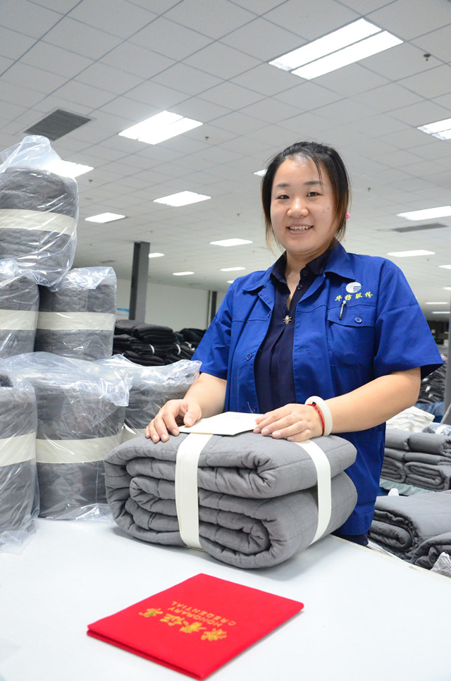來自家紡成品車間的統(tǒng)計數據顯示,8月份,裁剪工段裁剪水洗被貨單計劃為15012件,實際完成18340件,效率提升22.1%;其中Q號絎棉每人每天計劃目標完成184件,實際完成216件,效率提升17.55%;K號絎棉每人每天計劃目標完成158件,實際完成199件,效率提升26.35%。縫制工段的生產效率相比7月份效率,提升了11.97%,返修率:0.17%。后整工段完成基數提升5%后再提升10%的目標,其中驗整競賽產量基數為294件/人/天,實際完成331.1件/人/天,效率提升12.62%,完成了提升10%的競賽目標;包裝競賽產量基數為147件/人/天,目標產量161.7件/人/天,實際完成162件/人/天,提升了10.2%,完成了提升10%的競賽目標。