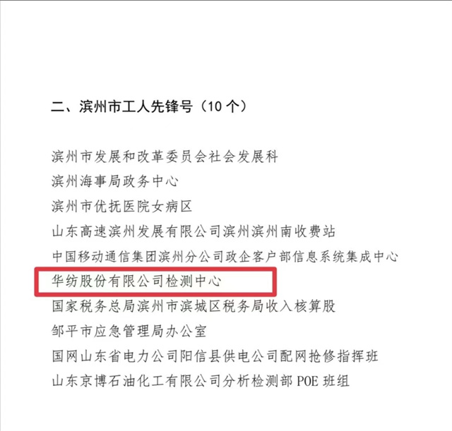 近日,濱州市總工會印發“關于濱州市五一勞動獎章和濱州市工人先鋒號的通報”,對華紡股份有限公司檢測中心等“濱州市十佳建功立業標兵崗”的集體,授予“濱州市工人先鋒號”榮譽稱號。