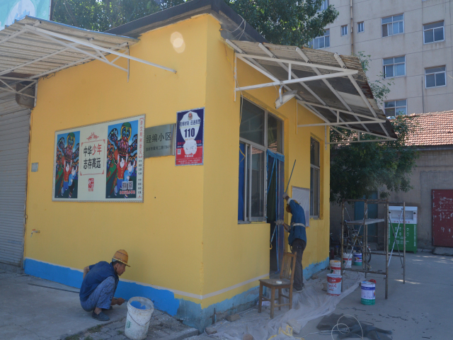 圖為公司志愿者粉刷經編小區警衛室、清理周邊環境衛生等情形。