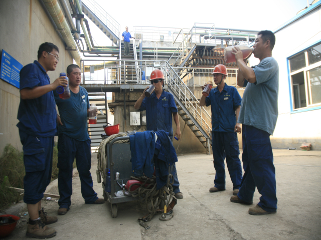 公司污水處理改造工程近來正在緊鑼密鼓地推進,大家盯靠在現場,實在太渴了,就咕咚咕咚喝一通綠豆湯。他們的目標是:保質保量,全力投入,爭取提前完成這項重點工程。