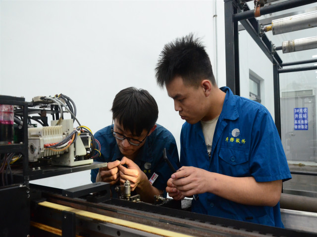 圖為家紡車(chē)間呂鵬廷(左)與尹廣濤在修復(fù)光柵讀頭。